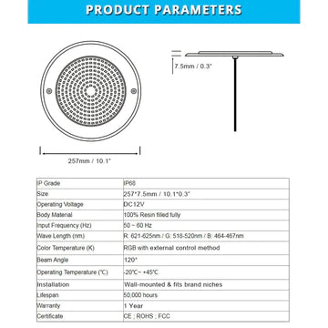 The smooth color change quality of the light gives a nice ambiance to your backyard or pool area and great for parties and kids to enjoy. It has a flush mount finish to it sitting at 10" (Diameter) x .3" (Width). It is 12 Volt Power so installation is super easy and can also be connected to your low voltage landscape lighting system to all be controlled together. Less hassle with having to worry if your light is on or not and glues the rest of the landscape lighting all together. It also comes with 50 ft, 100 ft, or 150 ft (RGBW) or 15 ft, 50 ft, 100 ft, or 150 ft (RGB) of UL Listed Wire with the light fixture to fit most pools without having to add extra wire.