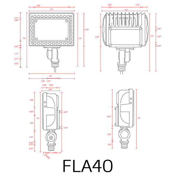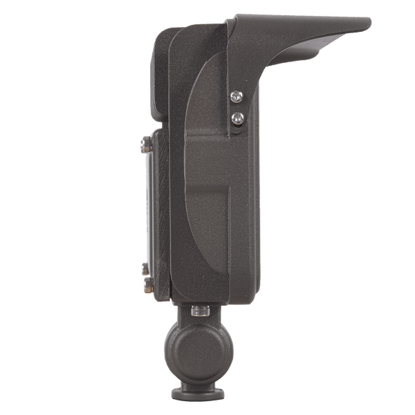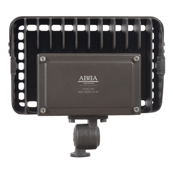 A 40W AC/DC 12V LED integrated light gives it a 3000K Warm White light color temperature. This adjustable aluminum LED flood light is built with IP65 waterproof technology so it can last through many weather conditions. The size of this directional wash flood light is 7.4" (L) x 1.95" (W) x 4.70" (H).