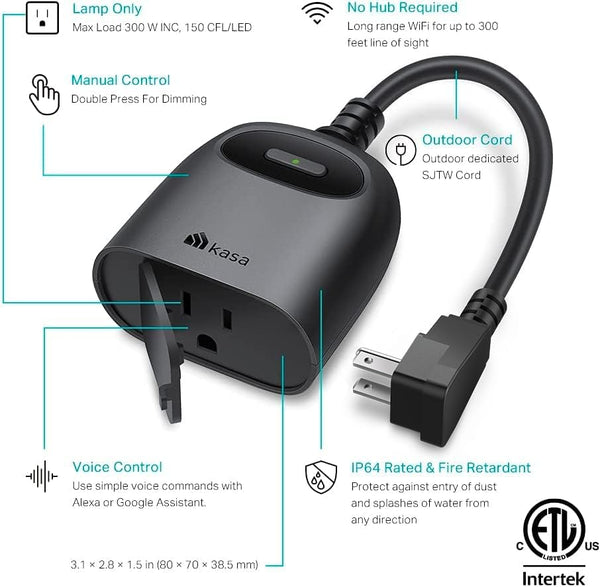 Extend your Smart Home to the outdoors with the Kasa Dimmable Outdoor Smart Plug with landscape lighting, swimming pool pumps, holiday lights, or other appliances. Use the sunrise/sunset offsetting to better schedule your connected device. The Kasa app contains not only all the features you expect from TP-Link Kasa family including smart actions, but also guidance for you through each step of the installation to connect your smart plug with your home Wi-Fi, Alexa or Google assistant.