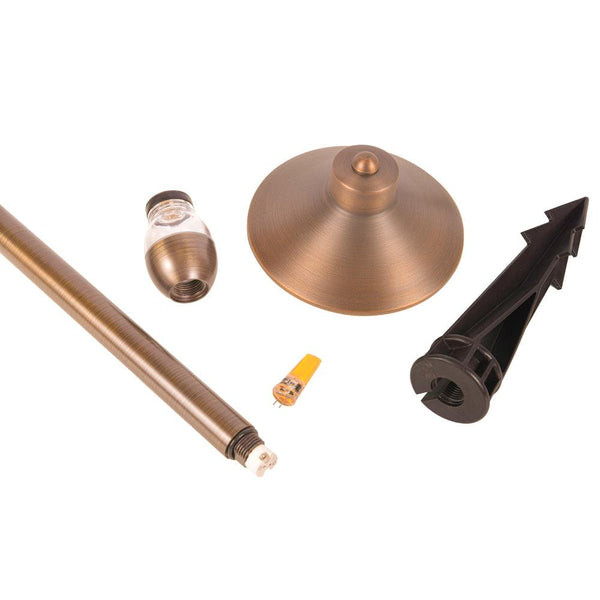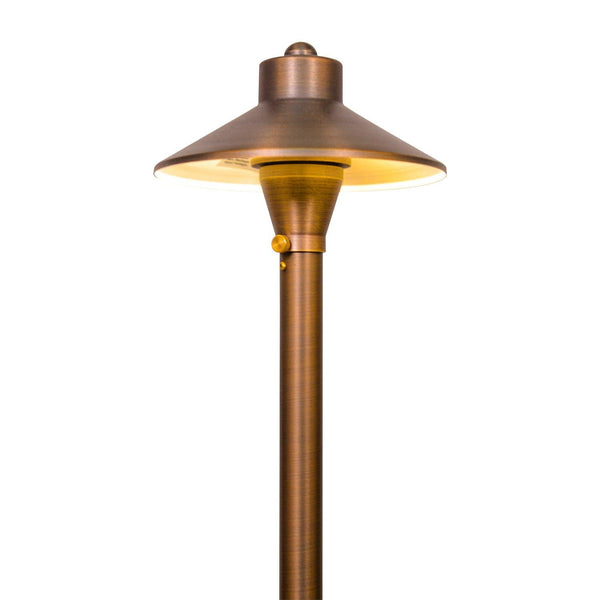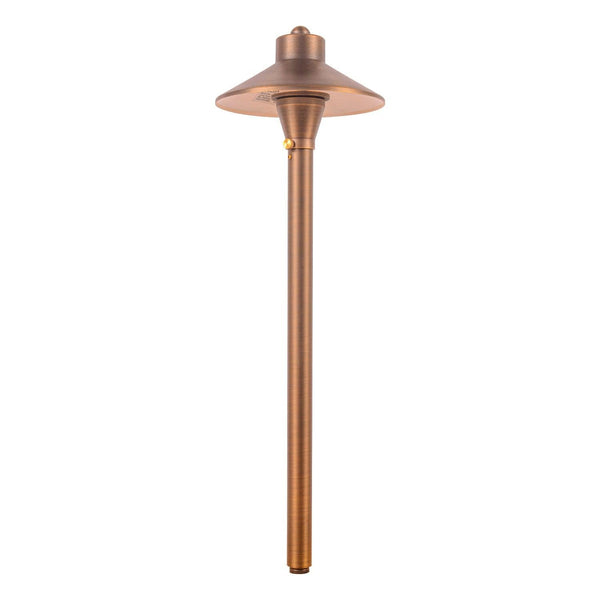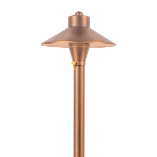 PLB03 LED max spread brass mushroom path & area light with ABS spike stake consumes less energy than incandescent lights and is IP65 waterproof, making it a reliable and cost-saving lighting fixture for your home's exterior space. This high-quality retro style led low voltage pathway light is made of heavy-duty cast brass, giving it a solid construction for durability and a lifetime of beauty. Its hat size is 6.5" x 3" and pole size is 20.5".
