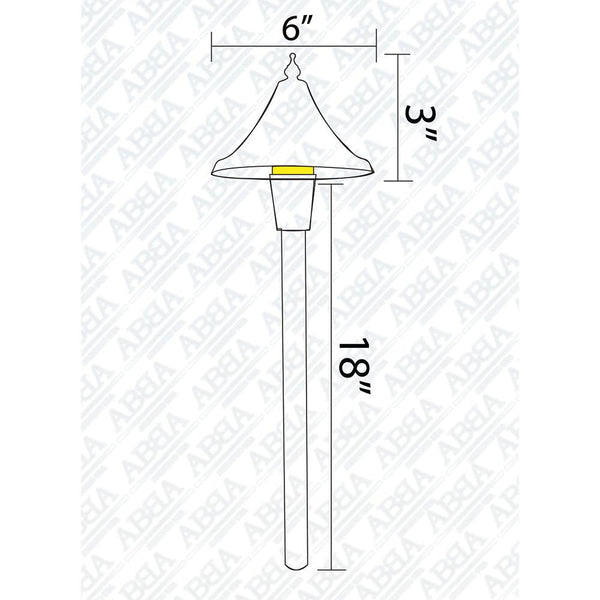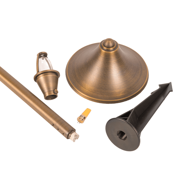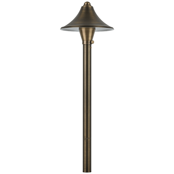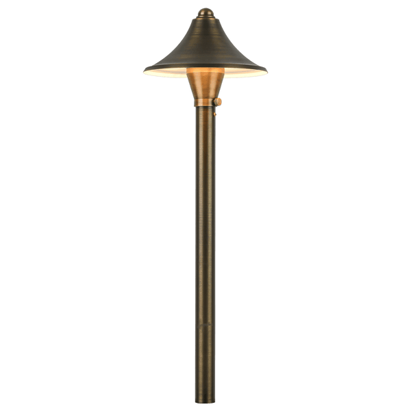 The PLB09 LED brass landscape lighting path & area light with ABS ground spike stake with cone hat consumes less energy than incandescent lights and is IP65 waterproof, making it a reliable and cost-saving landscape lighting fixture for your home's exterior space. This high-quality antique style led pathway light is made of heavy-duty cast brass, giving it a solid construction for durability and a lifetime of beauty. Its hat size is 6" x 3" and pole size is 18".