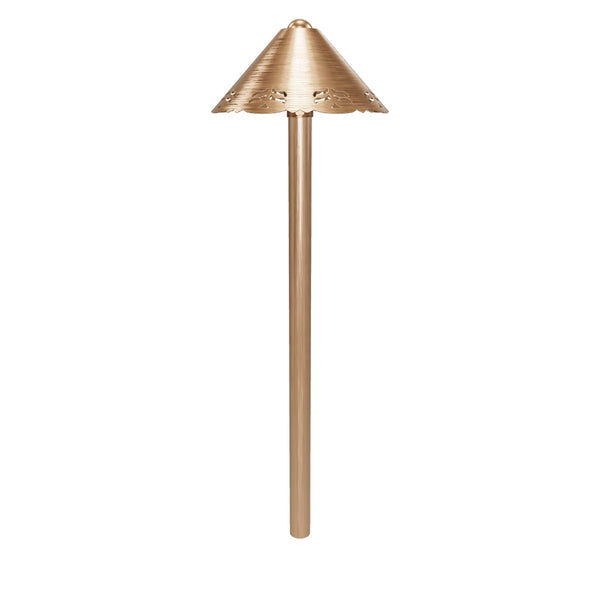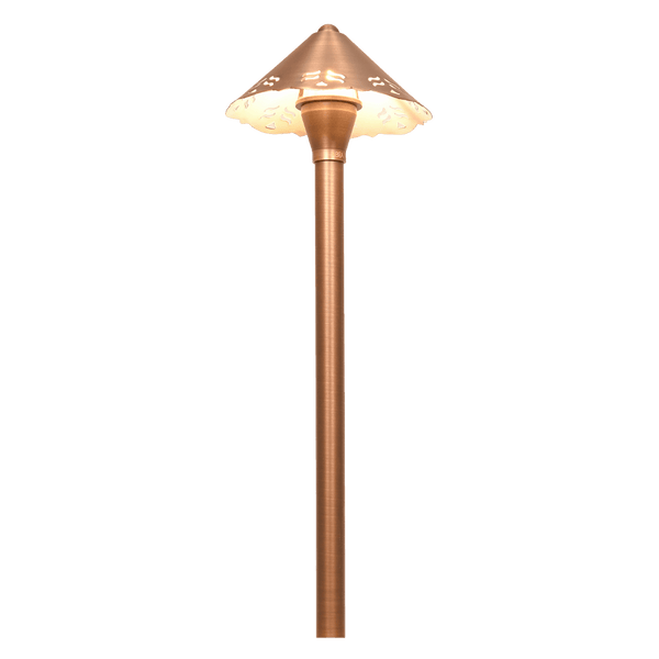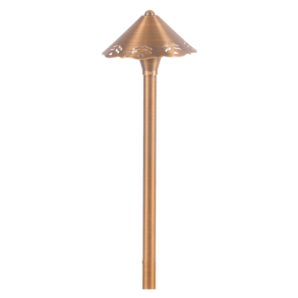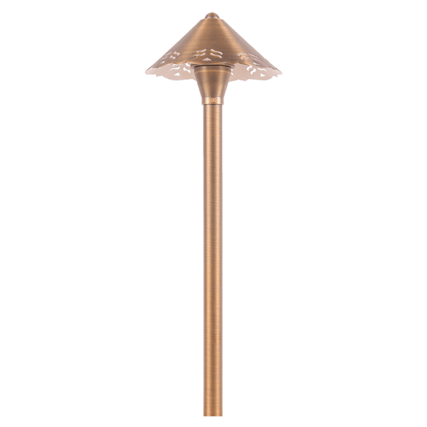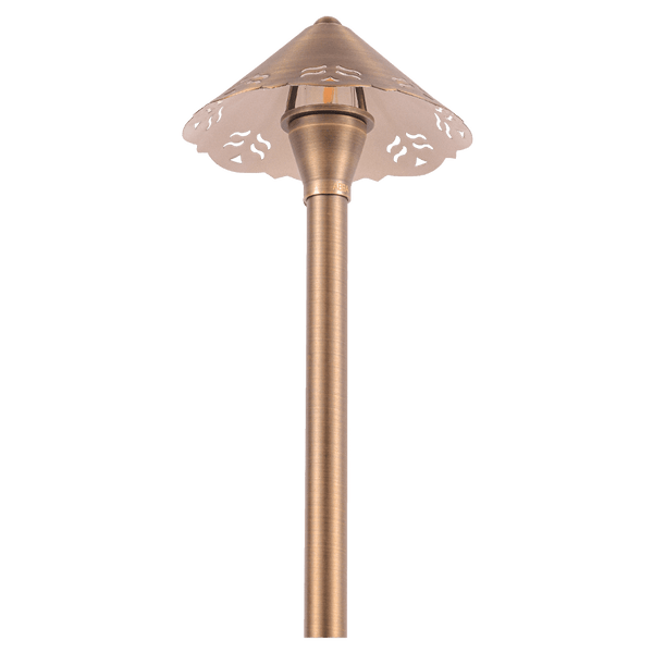 The PLB12 LED brass mushroom path & area light with ABS ground spike stake with a chiseled design that consumes less energy than incandescent lights and is IP65 waterproof, making it a reliable and cost-saving lighting fixture for your home's exterior space. This high-quality antique style led pathway light is made of heavy-duty cast brass, giving it a solid construction for durability and a lifetime of beauty. Its hat size is 7" x 3" and pole size is 18".