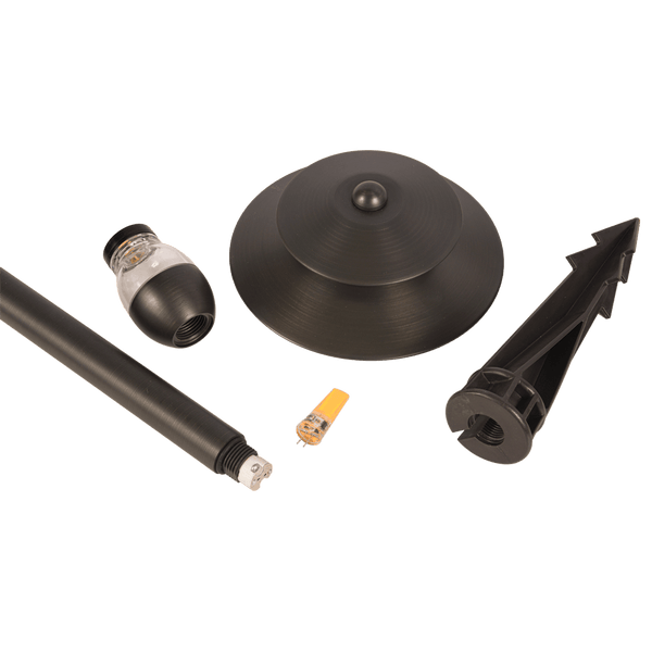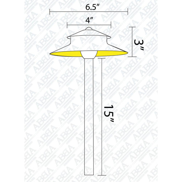 It's hat size 6" x 3" and pole size 17". It's easy to assemble, ABS ground spike is also included for staking into the ground. Bi-pin base G4 12V LED Bulbs can be added to bring a 3000K warm white light glow and create a comfortable and pleasing atmosphere. It’s a perfect choice for general site garden path lighting, alleys, loading docks, lawns, balconies, doorways, bus stations, streets, pathways, and parking areas.
