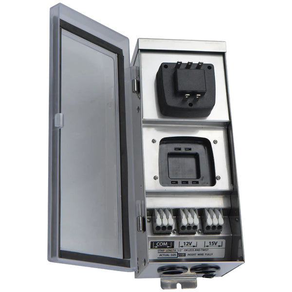 This heavy-duty Smart Wi-Fi enabled 300 Watt stainless steel low voltage digital transformer is an energy-efficient, safe, reliable outdoor transformer with 12V and 15V Output. It has a Plug-in photocell and digital timer and also 40" Plug-in 3 prongs cord is included. With its Wi-Fi capabilities, you may connect your transformer to your phone and control it via Smart phone to add timers, Schedules, and much more.