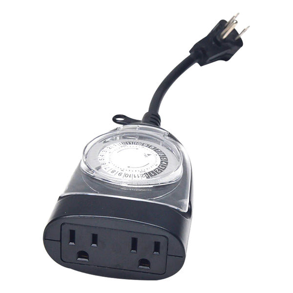 This outdoor plug-in manual mechanical timer features 2-grounded outlets and a 24-hour time cycle. Using a timer to reduce the operation time of your electronics can save you money and energy by eliminating the need to constantly turn the devices on and off daily.